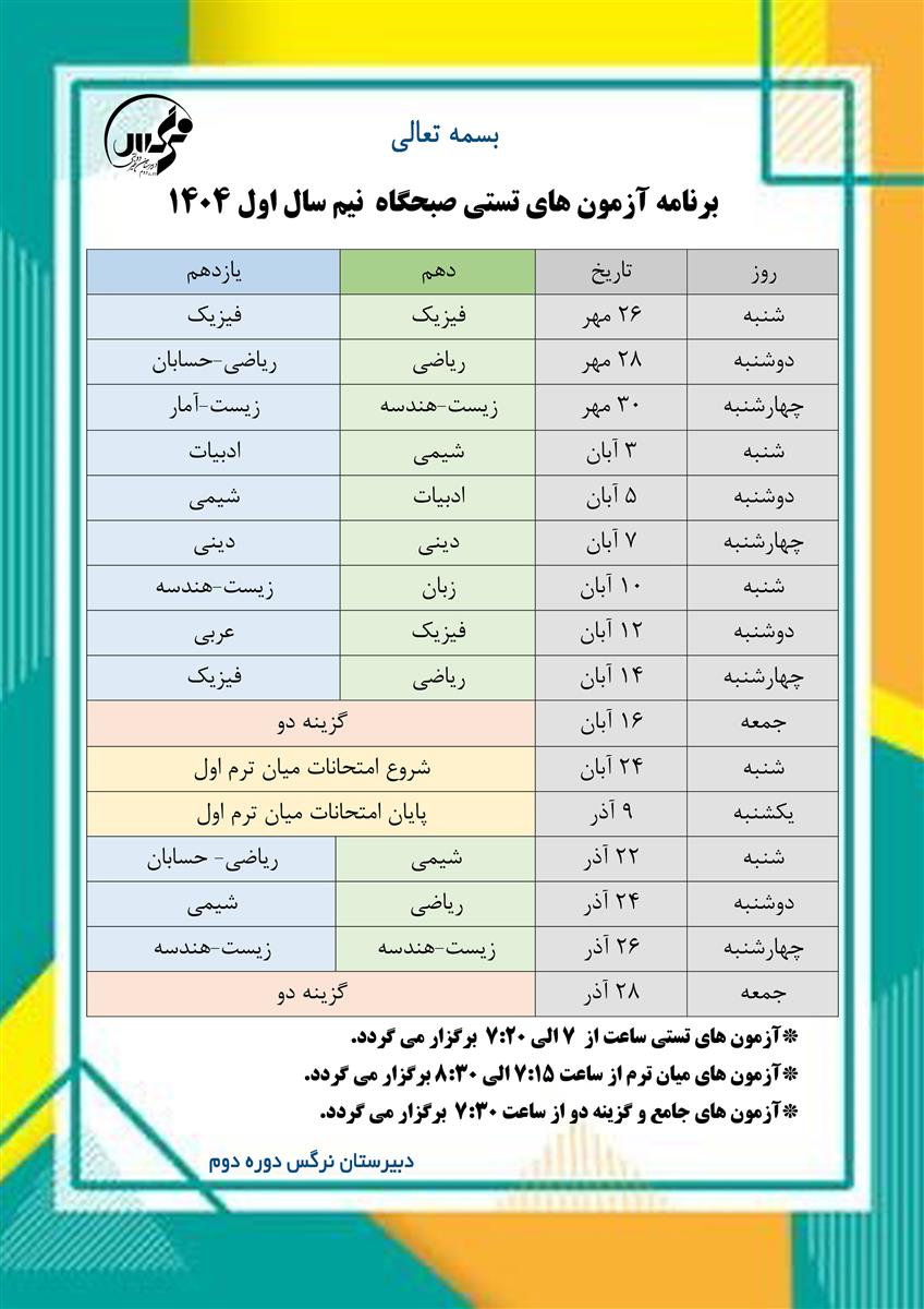 برنامه آزمون های تستی صبحگاه نیم سال اول